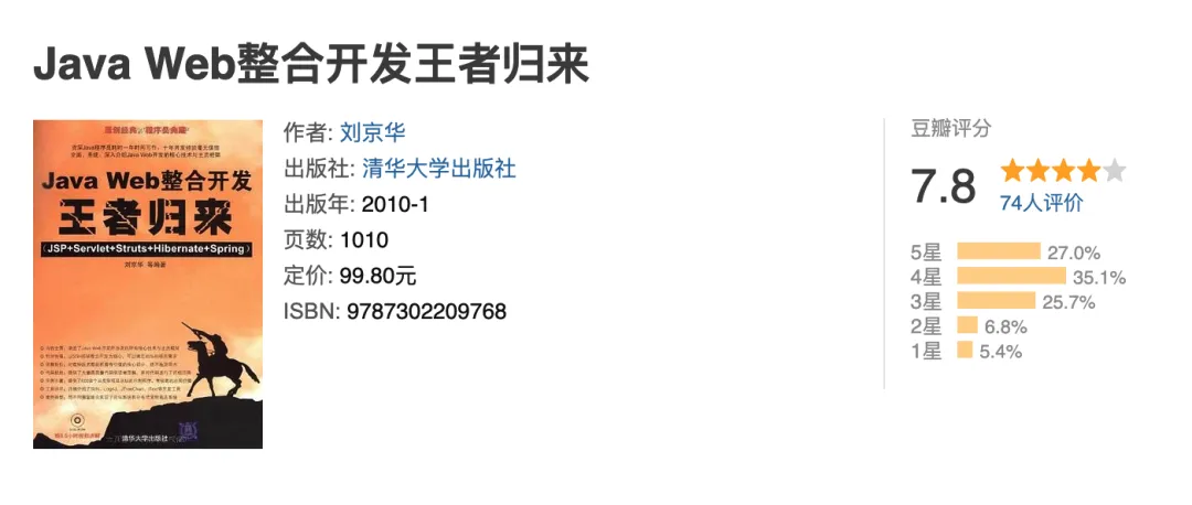 举个例子,我刚开始学习 Java 后端开发的时候,完全没什么经验,就随便买了一本书开始看。当时看的是 《Java Web 整合开发王者归来》 这本书(梦开始的地方)。