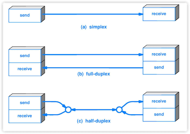 - 根据双方信息交互的方式,通信可划分为单向通信(或单工通信),双向交替通信(或半双工通信),双向同时通信(全双工通信)。