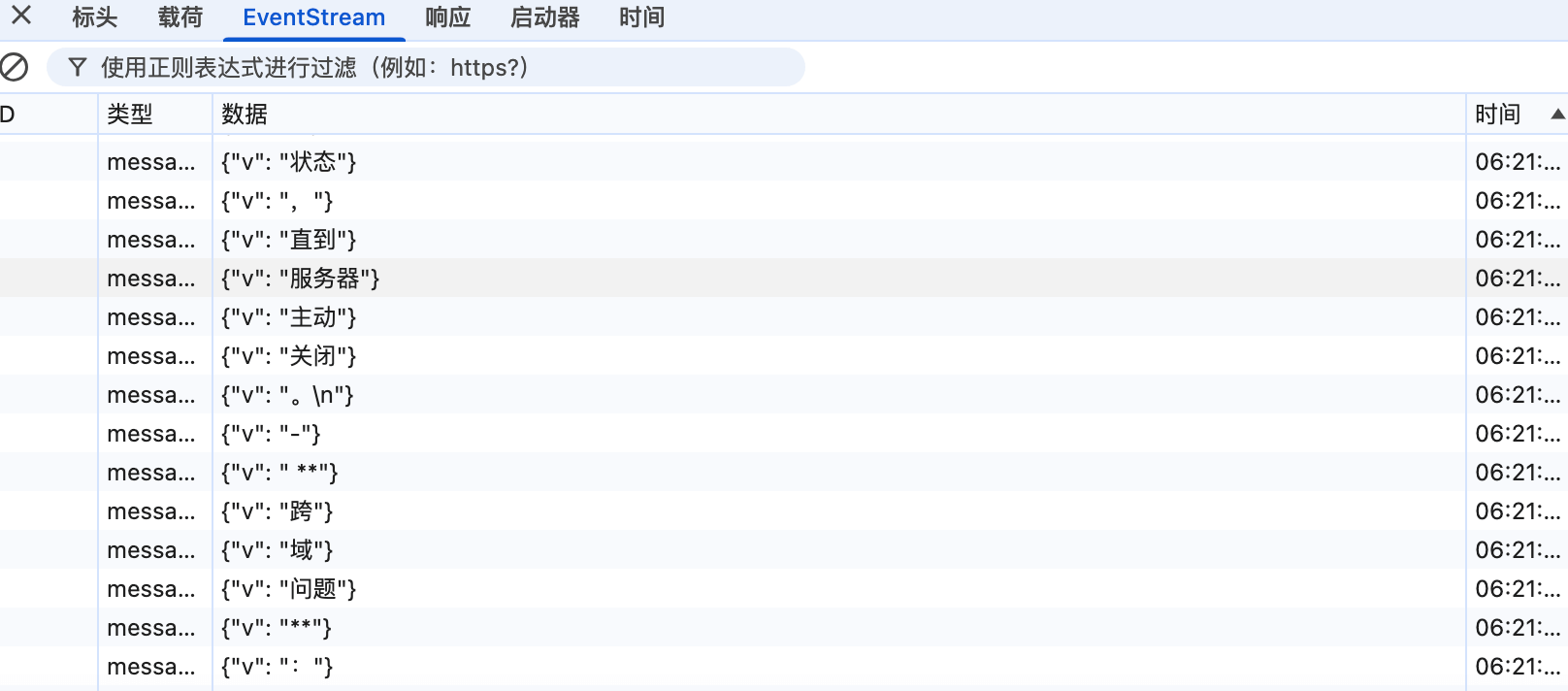 可以看到,响应头应里包含了 text/event-stream,说明使用的确实是 SSE。并且,响应数据也确实是持续分块传输。
