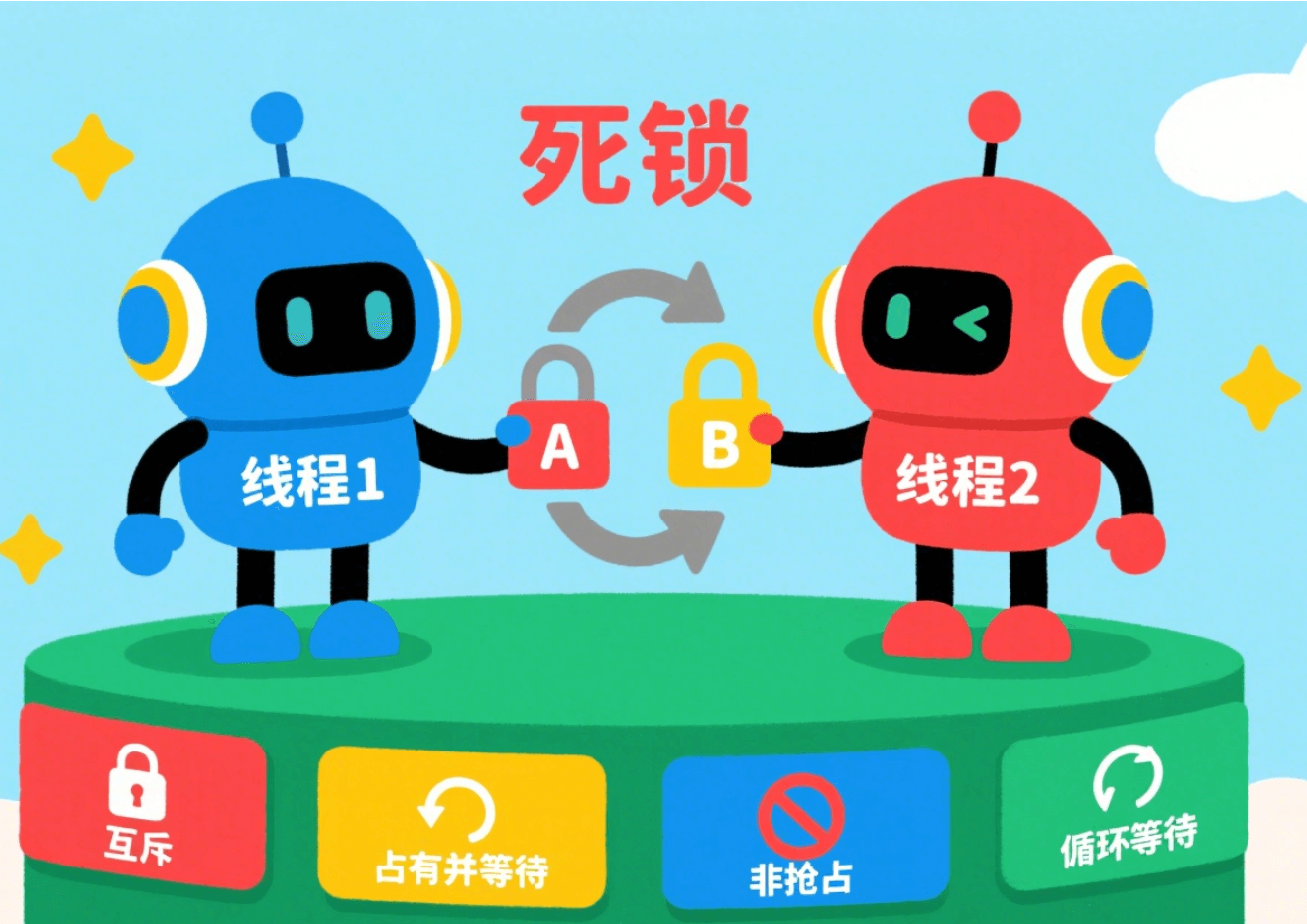 死锁的发生并不是偶然的,它需要同时满足四个必要条件: