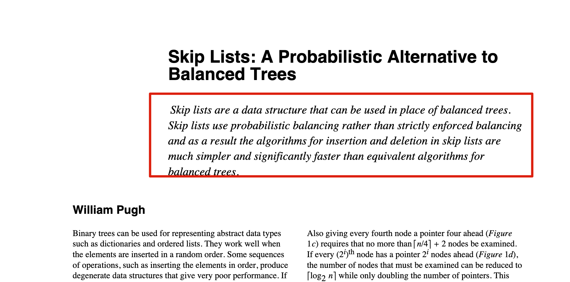 Skip lists are a data structure that can be used in place of balanced trees. Skip lists use probabilistic balancing rather than strictly enforced balancing and as a result the algorithms for insertion and deletion in skip lists are much simpler and significantly faster than equivalent algorithms for balanced trees.