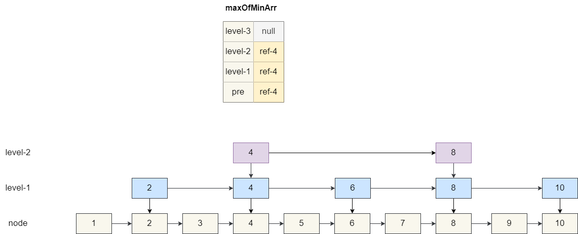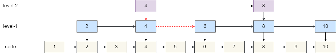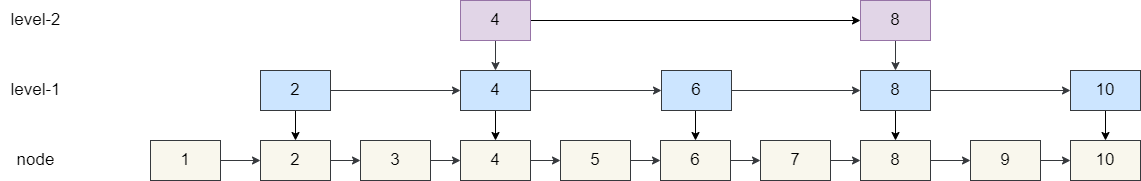 可能这里说的有些抽象,我们举个例子,以下图跳表为例,其原始链表存储按序存储 1-10,有 2 级索引,每级索引的索引个数都是基于下层元素个数的一半。