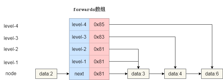 以下图为例,我们forwards数组长度为 5,其中索引 0记录的是原始链表节点的后继节点地址,而其余自底向上表示从 1 级索引到 4 级索引的后继节点指向。