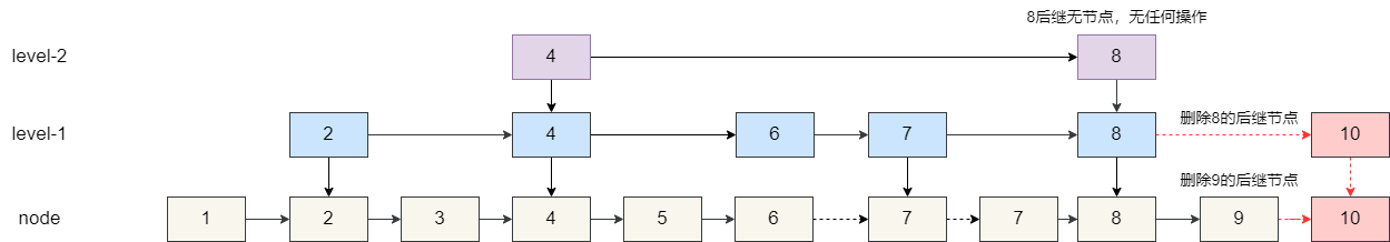 - 索引 8 无后继节点,该层无要删除的元素,指针直接向下。