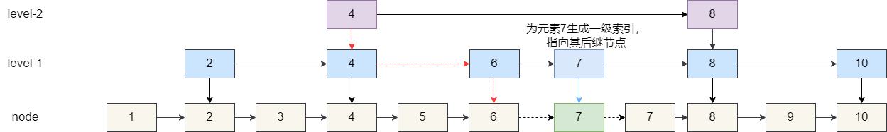 我们回过头,上述插入 7 之后,我们通过随机算法得到 2,即要为其建立 1 级索引: