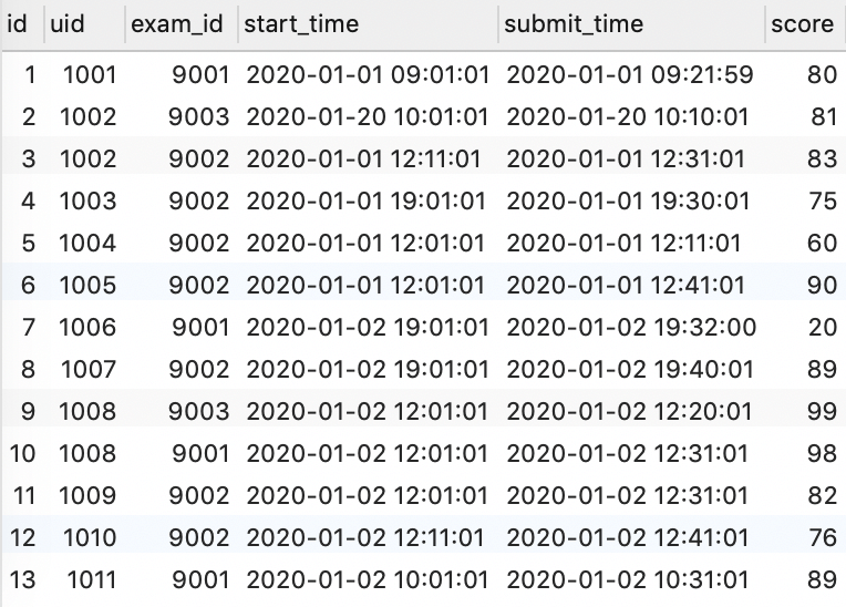 | id | uid | exam_id | start_time | submit_time | score |