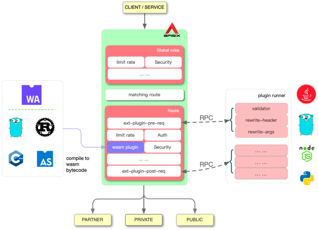 - 使用 Wasm(WebAssembly) 开发插件。Wasm 被嵌入到了 APISIX 中,用户可以使用 Wasm 去编译成 Wasm 的字节码在 APISIX 中运行。