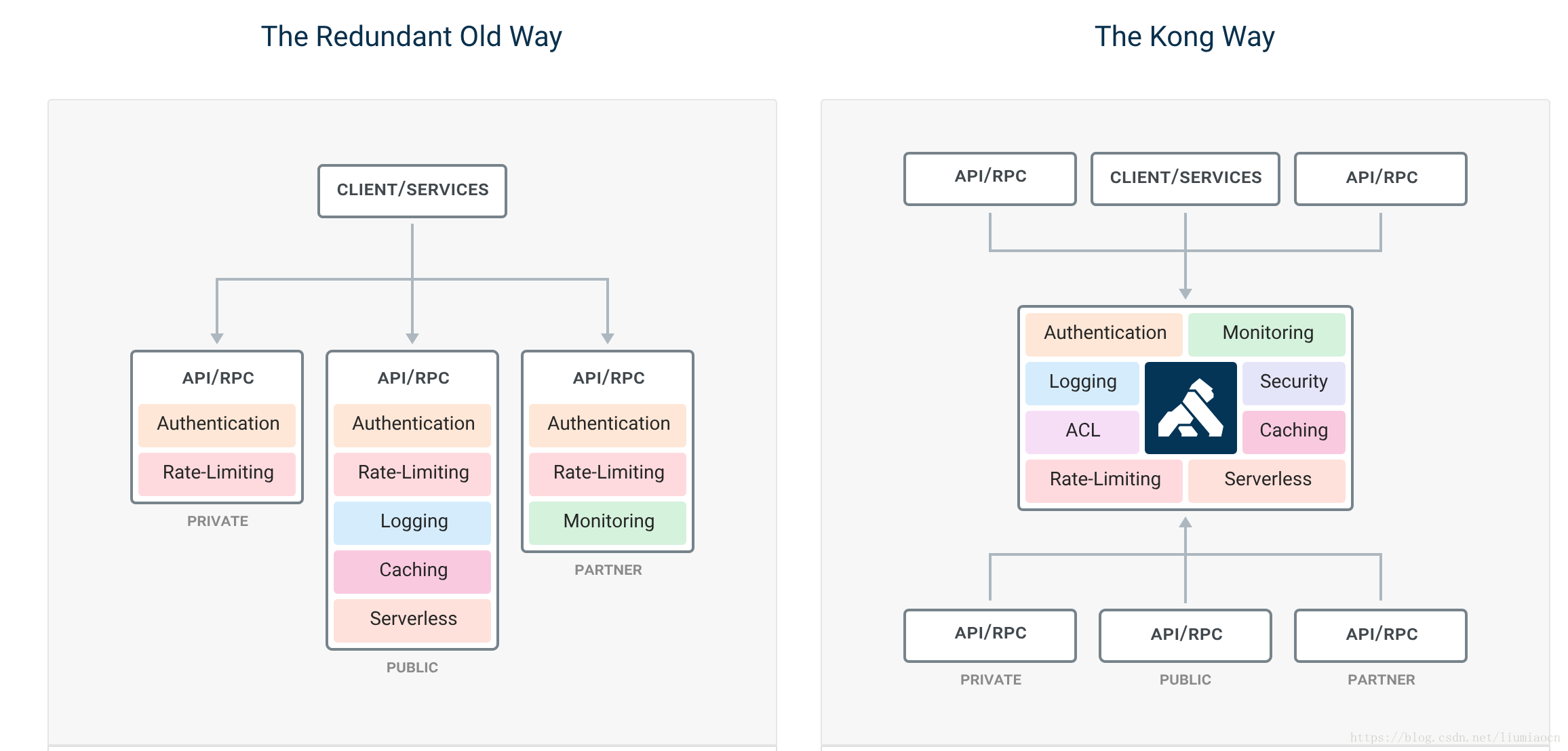 - Kong Server:基于 Nginx 的服务器,用来接收 API 请求。