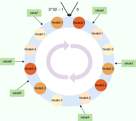 一致性哈希算法将哈希空间组织成一个环形结构,将数据和节点都映射到这个环上,然后根据顺时针的规则确定数据或请求应该分配到哪个节点上。通常情况下,哈希环的起点是 0,终点是 2^32 - 1,并且起点与终点连接,故这个环的整数分布范围是 [0, 2^32-1] 。
