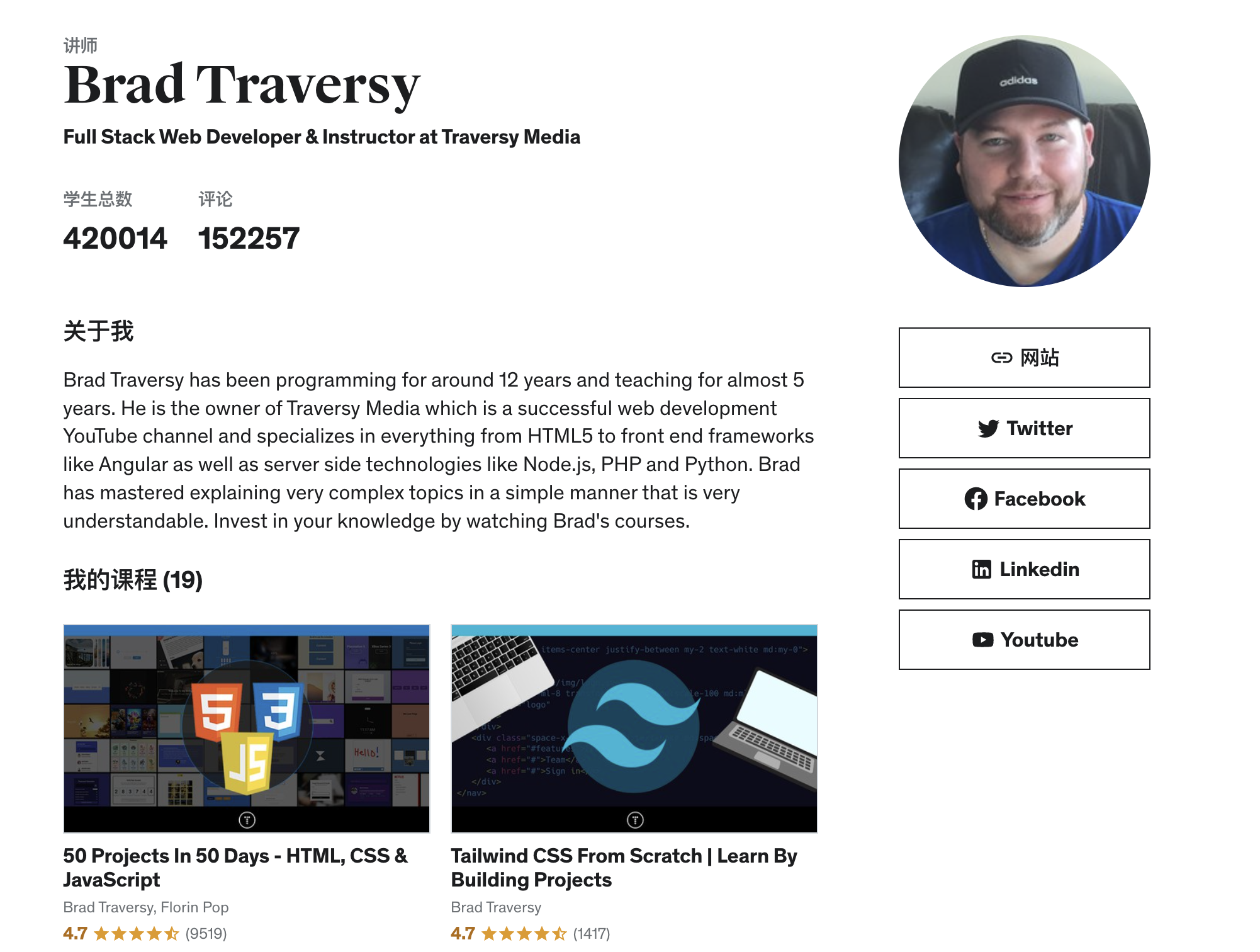 但是!!!Brad Traversy 目前是技术媒体领域的一个大 V,当前他在 Youtube 上的频道有 138 万多的订阅量,10 年累计输出 Web 开发和编程相关教学视频超过 800 个。Brad Traversy 也是 Udemy 上的一个成功讲师,目前已经在 Udemy 上累计输出课程 19 门,购课学生数量近 42 万。
