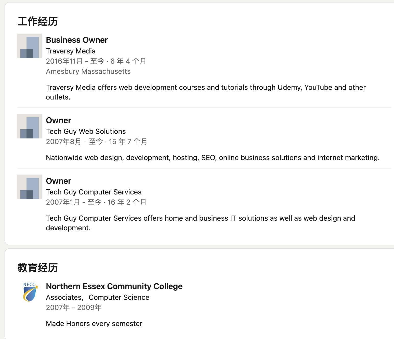 介绍到这里,有些同学可能会反驳说:波波你讲的这些大牛都是学历背景好,功底扎实起点高,所以他们才更能成功。其实不然,这里我再要介绍一位技术媒体界的大 V 叫 Brad Traversy,大家可以看他的 Linkedin 简历,背景很一般,学历差不多是一个非正规的社区大学(相当于大专),没有正规大厂工作经历,有限几份工作一直是在做网站外包。
