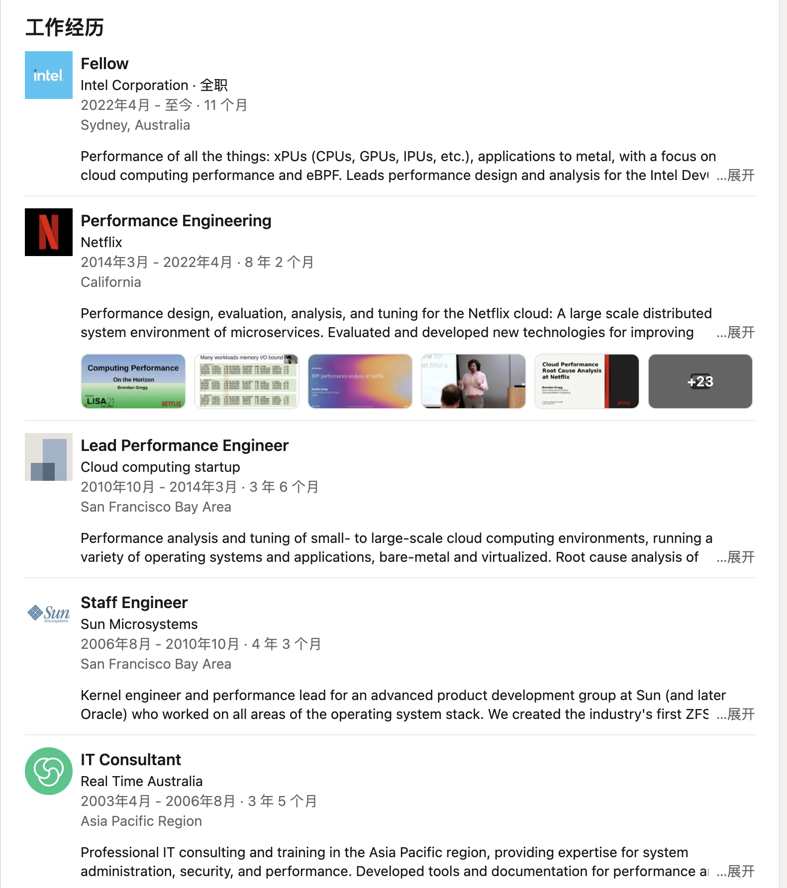 Brendan Gregg 之前是 Netflix 公司的高级性能架构师,在 Netflix 工作近 7 年。2022 年 4 月,他离开了 Netflix 去了 Intel,担任院士职位。
