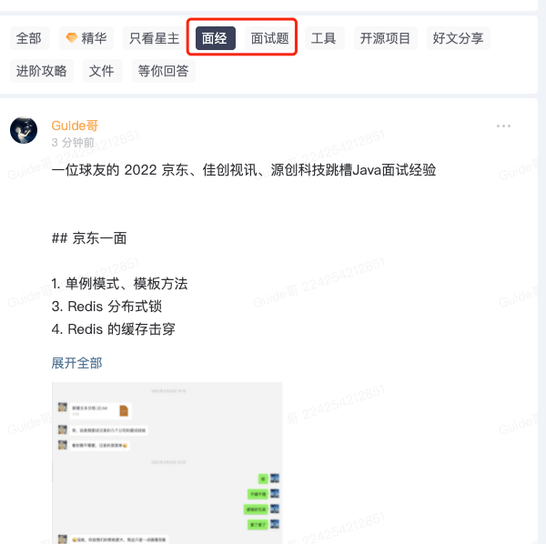 并且,知识星球还有专门分享面经和面试题的专题,里面会分享很多优质的面经和面试题。