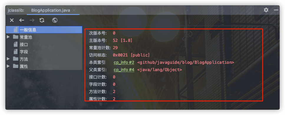 使用 jclasslib 不光可以直观地查看某个类对应的字节码文件,还可以查看类的基本信息、常量池、接口、属性、函数等信息。