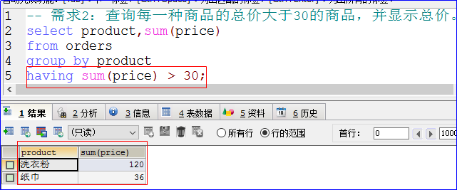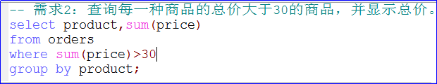 需求2:查询每一种商品的总价大于30的商品,并显示总价。