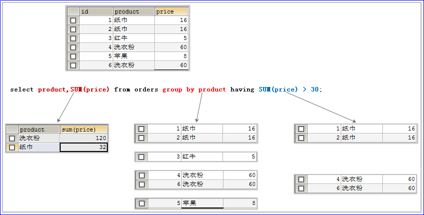 例如having中的 聚合函数(count,sum,avg,max,min),是不可以出现where条件中。