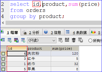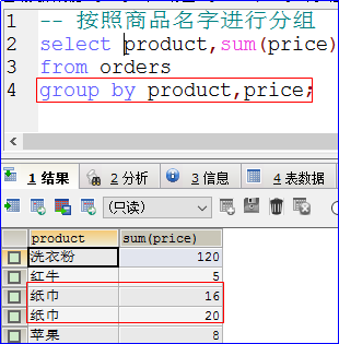 然后修改查询语句,要求是先按照商品名分组,然后在按照价格进行分组。