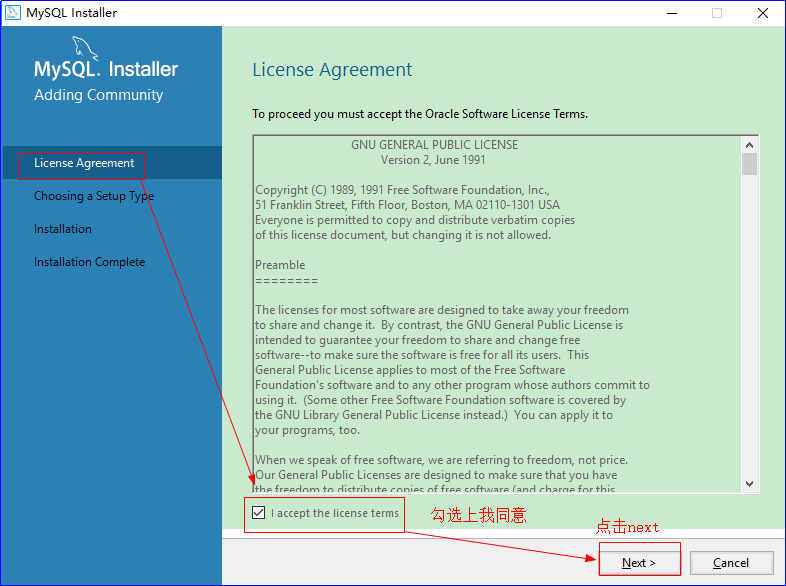 2.双击之后会出现如下图所示界面,询问是否同意,将我同意的选框勾选上,然后点击next,如下: