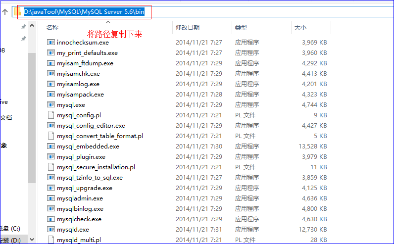 15.配置环境变量,找到MySql的安装目录的bin目录下,将路径复制下来