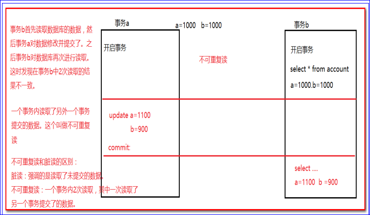 说明:事务b首先读取数据库的数据,然后事务a对数据修改并提交。之后事务b对数据库再次进行读取。这时发现在事务b中2次读取的结果不一致。