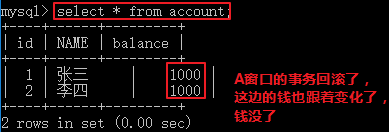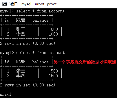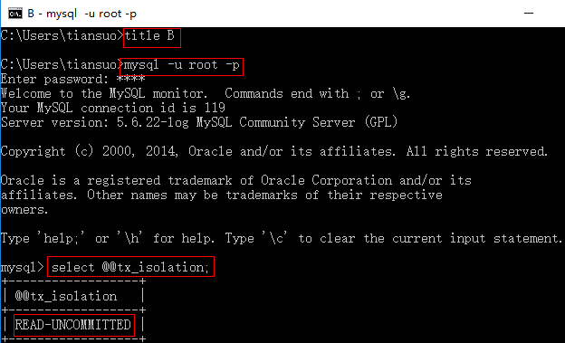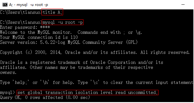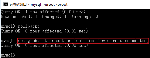 -- 设置窗口名字A title A -- 登录mysql数据库 mysql -u root -p 1234 -- 设置事务隔离级别 set global transaction isolation level read uncommitted;
