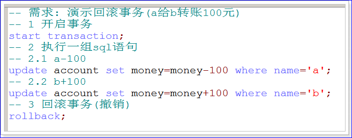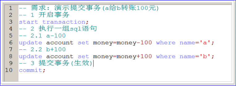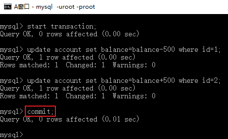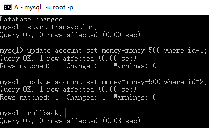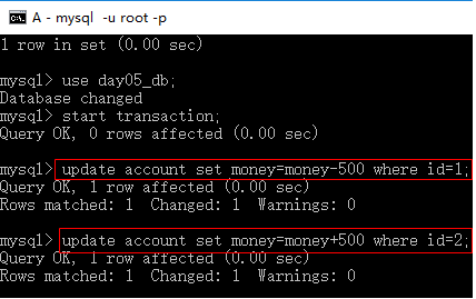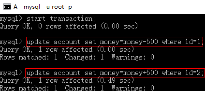 update account set money=money-500 where id=1; update account set money=money+500 where id=2;
