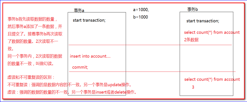 说明:事务b首先读取数据的数量,然后事务a添加了一条数据,并且提交了。接着事务b再次读取了数据的数量。2次读取不一致。