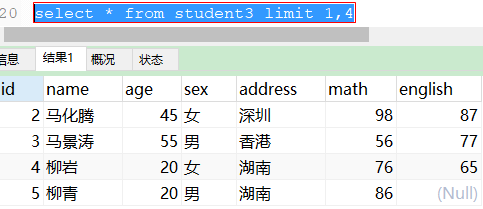 上述就表示从第2条记录开始查询,一共查询4条,即到第5条。