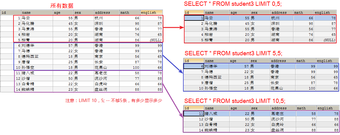 -- 第一页: LIMIT 0,5; 跳过0条,显示5条