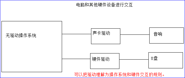要想搞清楚这个问题,我们必须了解下电脑是如何和其他硬件设备交互的。假设我们电脑安装完系统之后是一个无驱动的操作系统。那么当我们电脑想播放声音,即安装音响,必须得安装声卡驱动。同时电脑想和u盘硬件进行交互,也必须在电脑上安装对应的驱动。如果驱动安装失败,很显然他们是不能正常的交互的。这个安装驱动的其实就是为了定义他们两个相互交互的规则。只有统一了规则,才能交互。