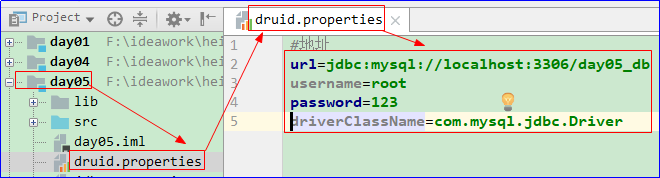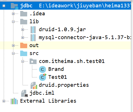 - 准备环境:1.创建项目 2.导入druid 和mysql驱动包 3.在src下面创建连接数据库的配置文件