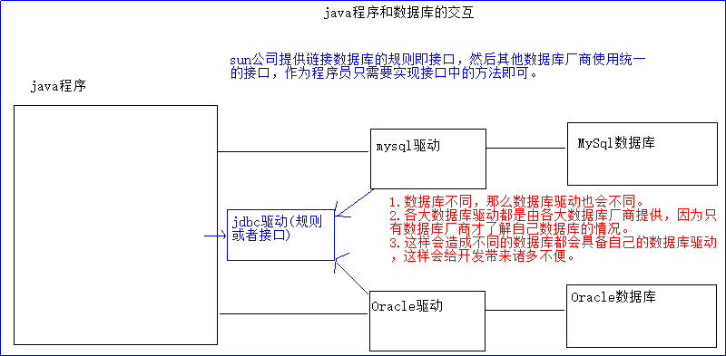从而会导致在开发中作为程序员由于安装不同的数据库驱动而浪费很多时间,同时和数据库交互的java代码也得重新书写,这样都会导致效率很低。所以说,sun公司就会制定一套规则,这套规则就是用来java程序连接数据库的,然后各大数据库厂商只需要实现这个规则即可。这个规则就是jdbc技术,即接口。