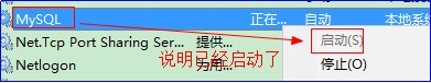 找到MySQL服务,查看MySQL服务是否已经启动了,如果启动是灰色,说明已经启动了。