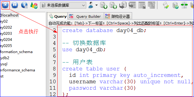 打开可视化工具,将如下sql语句添加到可视化工具中,并执行以下sql语句即可。