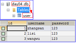 2、创建数据库和创建user表,并添加信息,sql语句如下。