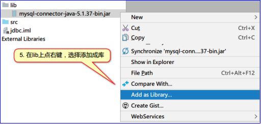3、在导入的mysql的jar包上右键,选择Add as Library...