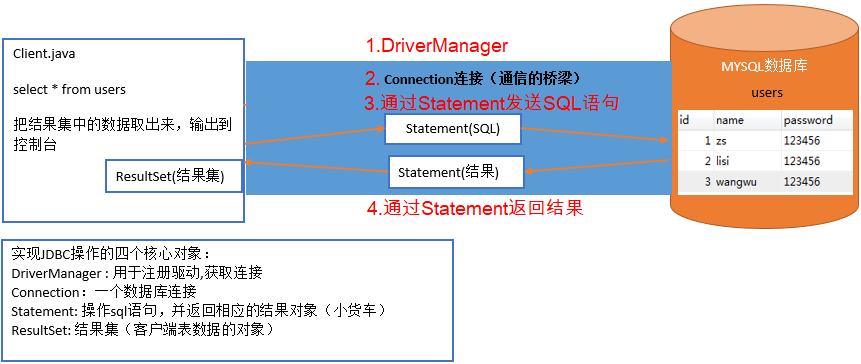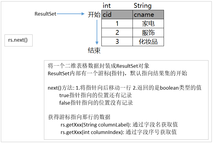 - ResultSet: 结果集或一张虚拟表。 Statement 发送sql语句,得到的结果 封装在 ResultSet 中。