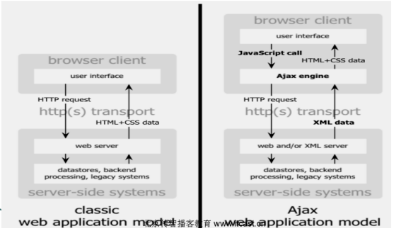 AJAX 的交互模型和传统交互模型的区别如下图所示: