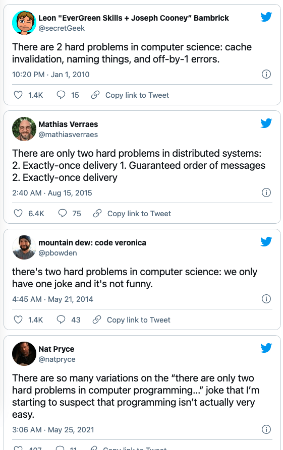 大名鼎鼎的《重构》的作者老马(Martin Fowler)曾经在TwoHardThings这篇文章中提到过 CS 领域有两大最难的事情:一是 缓存失效 ,一是 程序命名 。